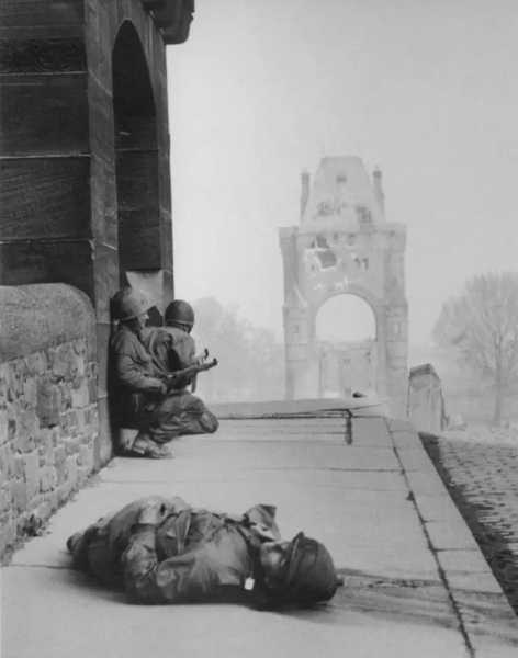 Американские солдаты на мосту Эрнста Людвига (с 1951 г. — мост Нибелунгов) в городе Вормс. На переднем плане — тело уложенного снайпером солдата. Позиция снайпера расположена на другом берегу Рейна. 28 марта 1945