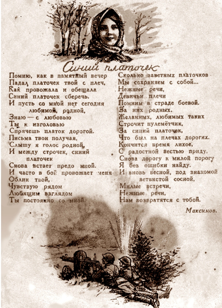 Узнав о том, что Максимов строчит стихи, Шульженко вдруг предложила: а напишите-ка новый текст на музыку Ежи Петербургского. Что-то важное, главное для суровых окопных будней разглядела певица в миролюбивой довоенной песенке “Синий платочек”.